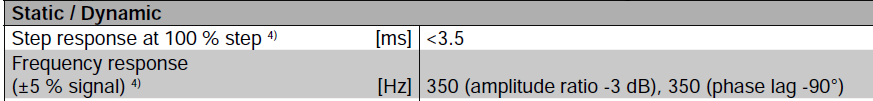 從圖中即可看到控制信號為5%時,幅頻響應及相頻響應特性都為350Hz;這從樣本參數表里也得到驗證,350Hz的頻響特性已經達到甚至超過了部分伺服閥的性能。